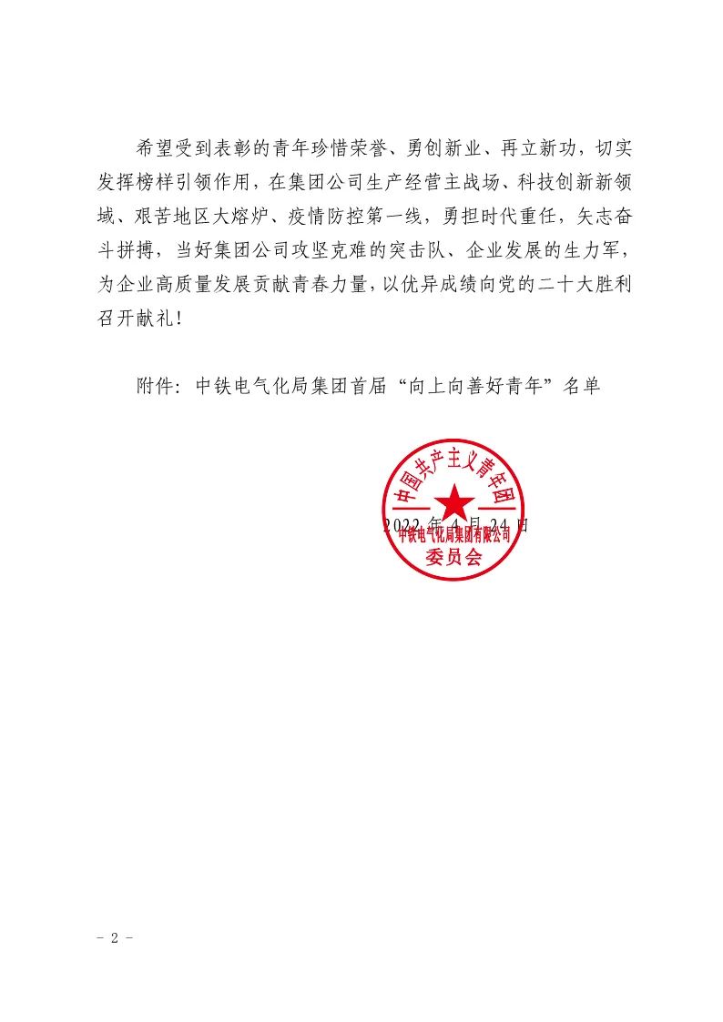 高铁电气团委始终坚持以习近平新时代中国特色社会主义思想为指导,以习近平总书记关于青年工作重要思想为指引,在上级团委和公司党委的领导下,深化思想引领和精神素养提升,以先进典型事迹激励青年在生产经营、科技创新、疫情防控等艰难险阻任务中勇担时代重任,矢志奋斗拼搏,当好企业攻坚克难的突击队、蓬勃发展的生力军。广大团员青年以向上向善之姿喜迎党的二十大、以青春澎湃之力献礼建团100周年。