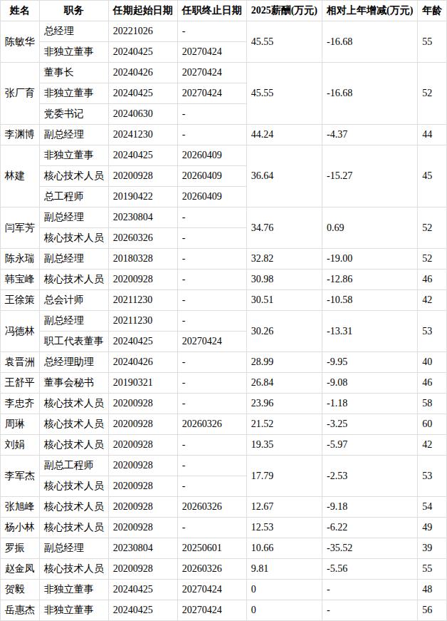 综上所述,本次离任的非独立董事、总工程师及核心技术人员林建,年龄45岁,在上述董事和高管中排16/21,2025年薪酬为36.64万元,在董事和高管中排4/18,对公司有何影响,新浪财经-鹰眼工作室将持续关注。
