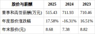 近三年董事和高级管理人员薪酬方面,2023年薪酬总额为710.46万元,2024年薪酬总额为711.93万元,2025年薪酬总额为515.43万元。从2023年到2025年,董事和高管薪酬总额减少195.03万元,降幅27.45%。