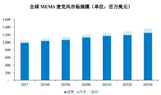 据YoleDevelopment 的数据统计,MEMS 麦克风市场规模从 2008 年的 1.05 亿美元,到2012 年的超过 4 亿美元,再到 2017 年突破 10 亿美元,出货量接近 50 亿颗,预计 2023 年全球 MEMS 麦克风市场规模将达到 13.63 亿美元,出货量也将进一步上升至 92.5 亿颗。