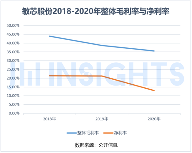 这也导致不少企业的毛利率快速下降,敏芯股份就是其中之一。在2018-2020年这三年中,其整体毛利率从44.03%下降到35.48%,相对应的净利率也从21.41%下降到12.92%,到了2021年上半年,毛利率再次下降到34.6%。