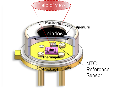 热电堆红外传感器可采用金属壳(TO)封装,传感器内部除了最核心的热电堆芯片外,还有用来校准环境温度的热敏电阻元件。当然,热电堆传感器也可以采用LGA等可以实现表面贴装(SMD)的其它封装形式。当传感器接收到红外辐射时,热电堆芯片上多对热电偶的电压叠加输出,从而将待测温度转化成电压信号。辅以高精度热敏电阻来测量热电堆红外传感器所处的环境温度,最后通过微处理器电路就可以计算得出最终测量温度。