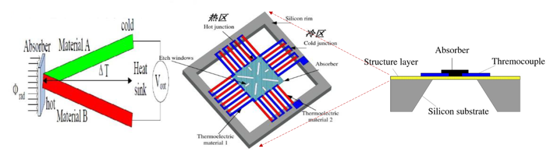 热电堆是基于塞贝克效应机理,采用硅基微加工工艺,在硅片支撑层上排布若干对、具有两种具有不同塞贝克系数材料的热电偶,把这些热电偶串联起来,就构成热电堆芯片。串联交接处中温度较高的一端通常被称作“热结”,较低的一端被称作“冷结”,热端与冷端之间形成一定的温差ΔT,材料中载流子沿着温度梯度降低的方向移动,引起电荷积累在冷结处,此时回路中便有温差电动势ΔV产生。此时,即可再通过电路将电动势转换成被测物体的实际温度。由于温差电动势ΔV的大小只取决于材料种类与温差,当热电偶的两种材料都确定后,其大小只和热电偶两端的温度差有关。
