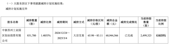 除了中新创投之外,公司曾经的第二大股东上海华芯创业投资企业(以下简称ldquo;华芯创投rdquo;)也曾减持过公司股份。2024年全年,华芯创投通过大宗交易共减持公司217.73万股股份,减持比例为3.89%。到了2024年年末,华芯创投的持股比例降为4.72%,不再是公司持股5%的股东。