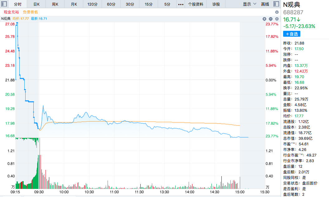 观典防务上市首日开盘参考价为21.88元/股(在全国股转系统最后一个有成交交易日的收盘价),今日股价表现是,以17.5元/股价格低开,盘中小幅冲高后震荡向下,最终报收16.71元/股,下跌23.63%。日成交额4.58亿元,换手率22.95%。
