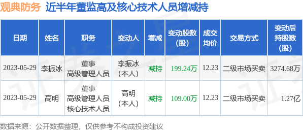 观典防务近半年内的董监高及核心技术人员增减持详情如下: