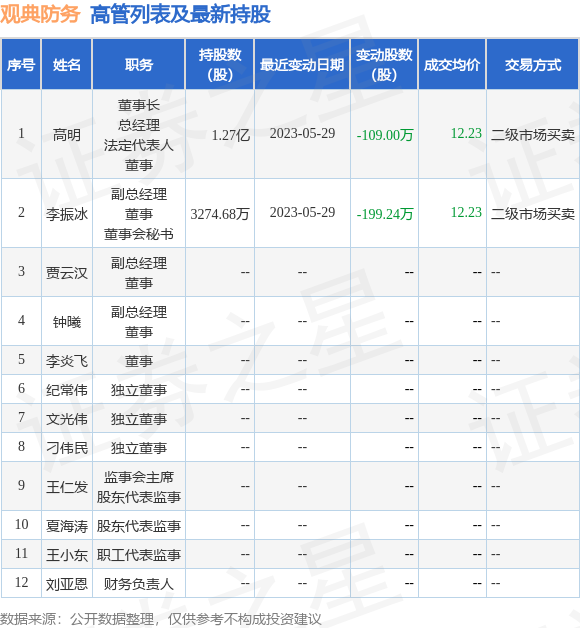 证券之星讯,根据6月13日市场公开信息、上市公司公告及交易所披露数据整理,观典防务(688287)最新董监高及相关人员股份变动情况:2023年5月29日公司董事,高级管理人员,核心技术人员高明、董事,高级管理人员李振冰共减持公司股份308.24万股,占公司总股本为0.9983%。变动期间公司股价下跌0.15%,5月29日当日收盘报13.77元。