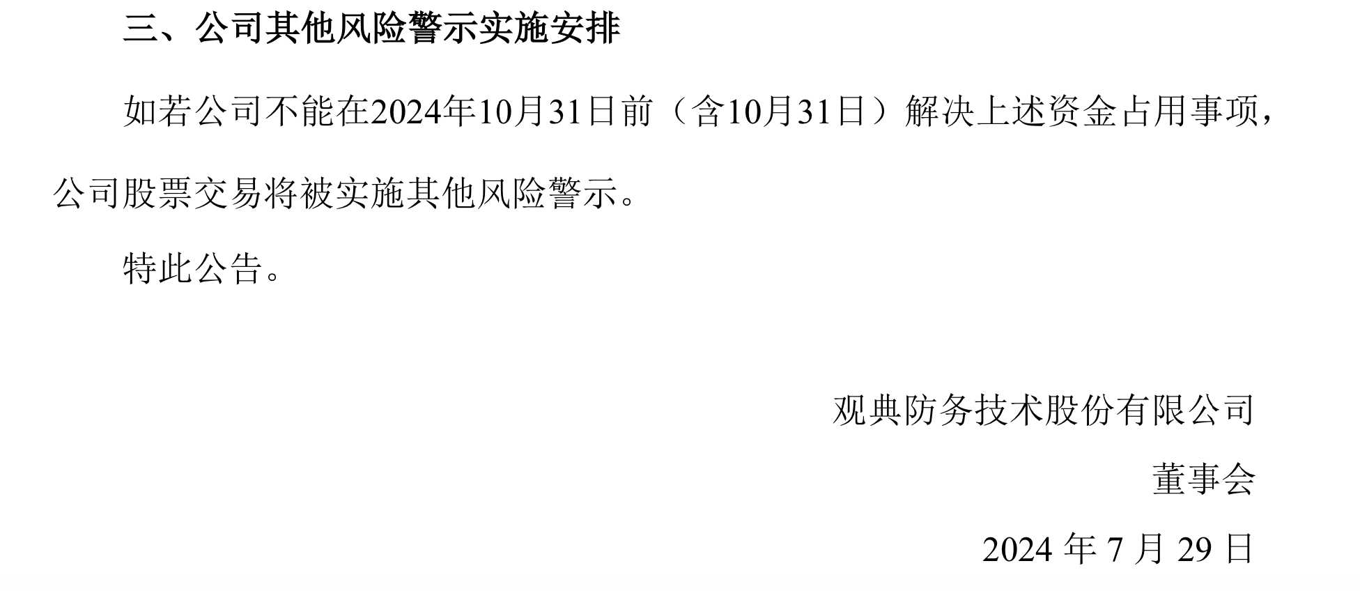 公告称,如若观典防务不能在2024年10月31日前(含10月31日)解决上述资金占用事项,公司股票交易将被实施其他风险警示。观典防务也对界面新闻称,公司也会本着对全体股东高度负责的态度,督促实际控制人积极筹措资金尽快偿还占用资金,以消除对公司的影响。