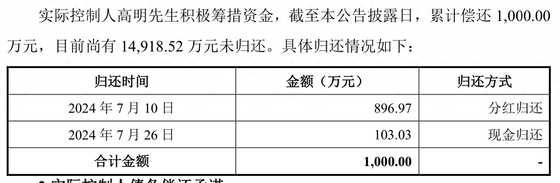 7月29日公告,观典防务自查发现截至2024年5月29日,未归还金额共计1.59亿元,构成实控人及其关联方对上市公司的资金占用,占公司最近一期经审计归母净资产的15.97%。观典防务表示,截至公告日,高明筹资偿还了1000万元,目前尚余1.49亿元未归还。