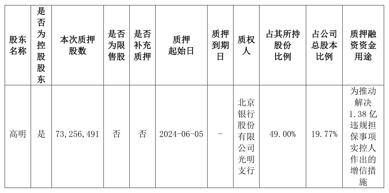 最新的质押情况则是高明质押7325.65万股给北京银行光明支行,用途系“为解决1.38亿违规担保事项实控人作出的增信措施”,质押起始日为6月5日。