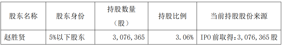 截至公告日,赵胜贤持有公司股份3,076,365股,占公司总股本的比例为3.06%;前述股份均为无限售流通股,来源于公司首次公开发行股票并上市前取得的股份。