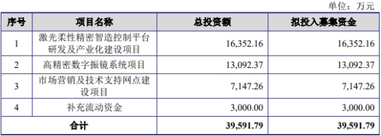 金橙子本次发行募集资金总额为68,709.76万元;扣除发行费用(不含增值税)后,募集资金净额为60,621.31万元。金橙子最终募集资金净额较原计划多21,029.52万元。金橙子于2022年10月19日披露的招股说明书显示,公司拟募集资金39,591.79万元,分别用于激光柔性精密智造控制平台研发及产业化建设项目、高精密数字振镜系统项目、市场营销及技术支持网点建设项目、补充流动资金。
