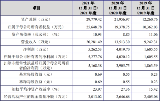 2019年、2020年、2021年,金橙子的营业收入分别为9,242.31万元、13,513.30万元、20,281.49万元;归属于母公司所有者的净利润分别为1,605.55万元、4,020.12万元、5,277.76万元;扣除非经常性损益后归属于母公司所有者的净利润分别为1,863.59万元、3,905.75万元、5,168.38万元;经营活动产生的现金流量净额分别为2,405.06万元、2,646.66万元、3,013.02万元。