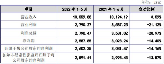 2022年1-6月,公司实现营业收入为10,559.88万元,较2021年同期增长3.59%;归属于母公司股东的净利润为2,602.35万元,较2021年同期下降14.16%;扣除非经常性损益后归属于母公司股东的净利润为2,591.41万元,较2021年同期下降13.57%;经营活动产生的现金流量净额为890.17万元,较2021年同期下降63.34%。