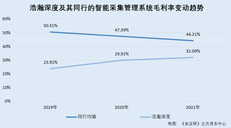 根据《金证研》北方资本中心研究,2019-2021年,浩瀚深度智能采集管理系统的毛利率,分别比同行可比公司毛利率均值低26.6个百分点、17.48个百分点、12.12个百分。