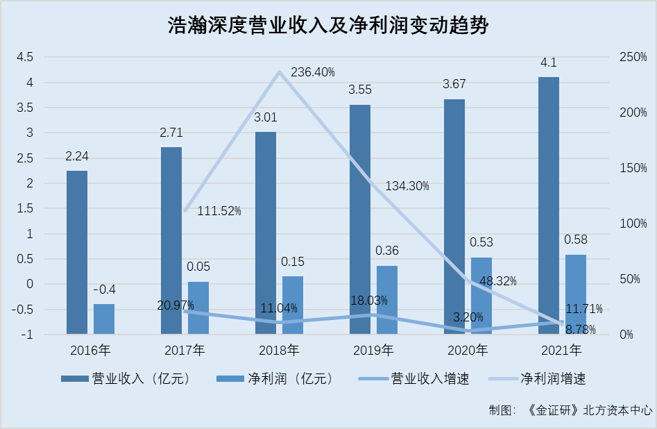 根据《金证研》北方资本中心研究,2017-2021年,浩瀚深度的营业收入增速分别为20.97%、11.04%、18.03%、3.2%、11.71%,净利润增速分别为111.52%、236.4%、134.3%、48.32%、8.78%。