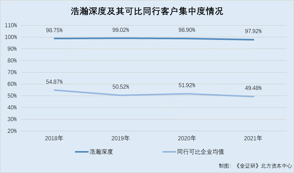 根据《金证研》北方资本中心研究,2018-2021年,浩瀚深度的同行可比公司的客户集中度均值分别为54.87%、50.52%、51.92%、49.48%,分别比浩瀚深度的客户集中度低43.88个百分点、48.64个百分点、46.98个百分点、48.44个百分点。
