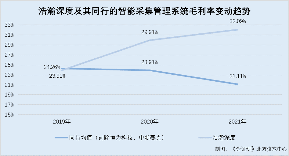 根据《金证研》北方资本中心研究,2019-2021年,浩瀚深度的智能采集管理系统的同行可比公司星网锐捷、天邑股份的毛利率均值分别为24.26%、23.91%、21.11%。