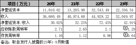 但“净营运资本/收入”指标逐年上涨,由20年的30.02%增加至23年的42.91%,应收和存货周转率均逐年下降,表明公司新增业务较历史业务增加了更多资金占用。