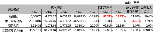 关于中国移动的业务拓展,募集说明书中披露,发行人主要通过单一来源采购方式参与中国移动扩容项目建设,招投标方式参与其新建项目建设。从下表可见,截至23年底,发行人单一来源采购方式和招投标销售收入占比分别为77.93%、19.4%,以单一来源采购方式为主,招投标为辅,两种方式的收入均呈上升趋势。各年同比变动方面,单一来源采购方式21年-23年收入同比增长率分别为18.61%、-2.6%、18.91%,21-23年复合增长率为11.16%,而招投标方式的收入21年同比下降12.99%,22年高增长,为85.27%,23年同比增长率下降至11.73%,与单一来源采购方式同比变动率相近,未来是否能大幅增长进而扩大占比尚不明朗。基于以上信息,估值之家认为,在行业竞争激烈的情况下,发行人收入主要依靠扩容项目,新产品市场竞争优势尚不明显,未来大概率在很长一段时间内仍会保持这种严重依赖单一客户的态势,客户集中及单一客户依赖风险将长期存在。