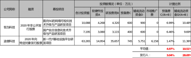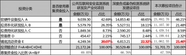 本次募投的两个项目投资额中,46.21%为软硬件设备投入,30.07%为研发投入,2.32%为预备费,21.4%为铺底流动资金,预备费和铺底流动资金金额分别为1,199.64万、11,062.55万。