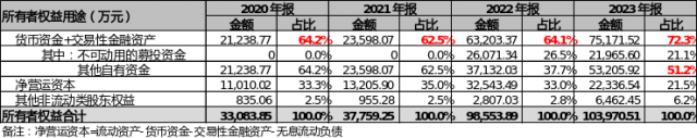 从股东权益分类占比来看,发行人20-23年末“货币资金+交易性金融资产”占比分别高达64.2%、62.5%、64.13%、72.3%,23年末即使扣减掉剩余募投资金,比例仍高达51.2%,剩余则主要为净营运资本。