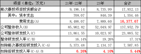 二、前次募投时间较近,超募比例高,23年末尚余40.53%的资金待投入;原计划募投项目预估整体投资额偏高,且资本支出投资额不及预期,前期立项论证严谨性存疑;公司整体研发投入占营收比例并未大幅增加,前次募资必要性存疑