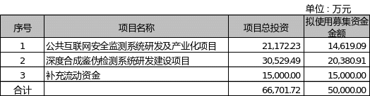 发行人向交易所递交的拟向不特定对象发行可转换公司债券申请于2023年12月被受理,募集资金总额不超过人民币50,000.00万元(含),扣除发行费用后拟投资于“公共互联网安全监测系统研发及产业化项目”14,619.09万、“深度合成鉴伪检测系统研发建设项目”20,380.91万、补充流动资金15,000.00万。本次发行的保荐机构为国金证券,审计机构为中兴财光华会计师事务所。