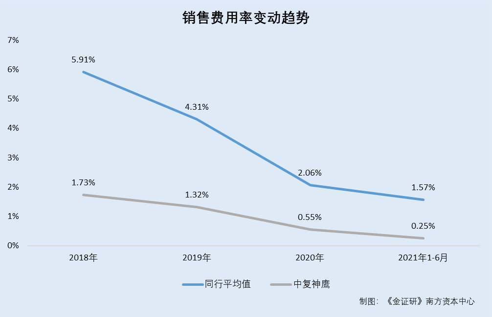 据招股书,2018-2020年以及2021年1-6月,中复神鹰销售费用分别为537.42万元、549.68万元、294.85万元、94.36万元,2019-2020年分别同比增长2.28%、-46.36%。同期,中复神鹰销售费用率分别为1.73%、1.32%、0.55%、0.25%。