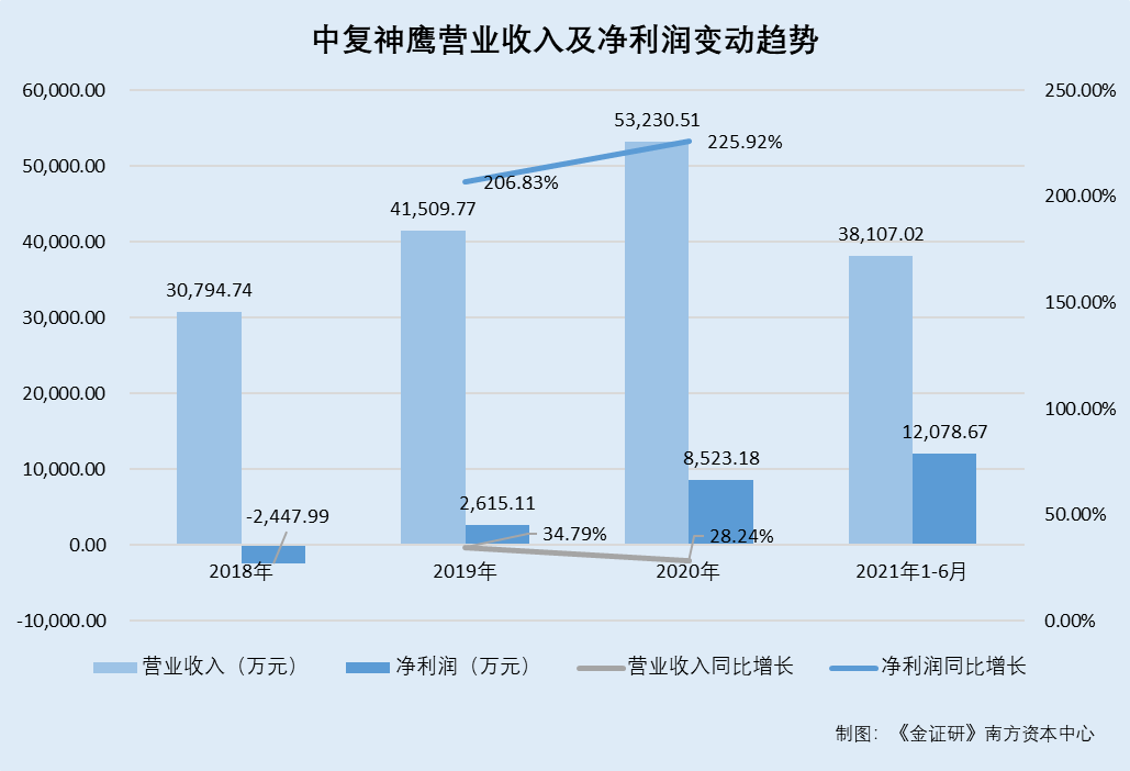2018-2020年,中复神鹰净利润分别为-2,447.99万元、2,615.11万元、8,523.18万元、12,078.67万元,2019-2020年分别同比增长206.83%、225.92%。
