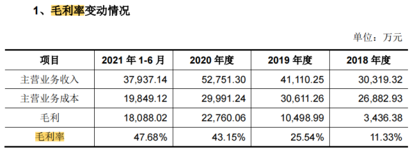 招股书显示,报告期内,中复神鹰的综合毛利率分别为11.33%、25.54%、43.15%和47.68%,呈不断上升趋势。