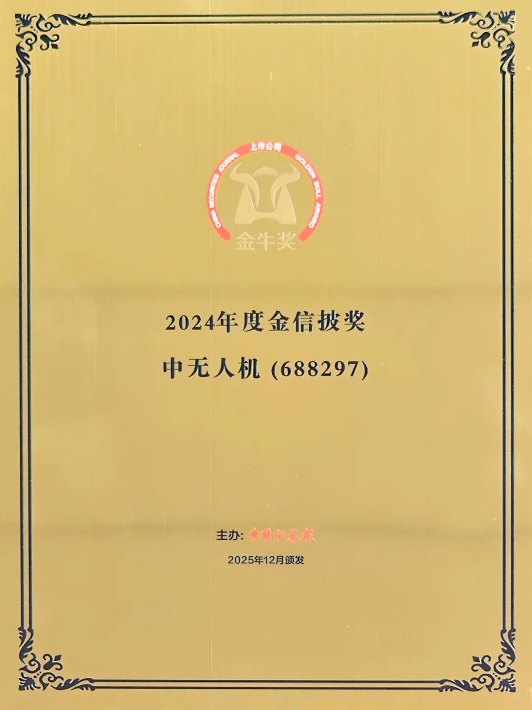 12月6日,由中国证券报主办的2025科创投资大会暨上市公司金牛奖(金信披奖)颁奖典礼在安徽合肥隆重举行, 中无人机 (股票代码:688297)凭借在信息披露、可持续发展管理等方面的优异表现,荣获“上市公司金牛奖(金信披奖)”。