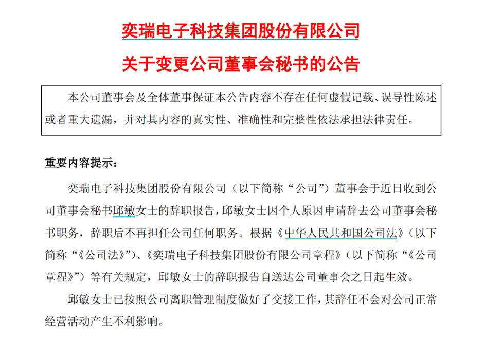 12月18日,奕瑞电子科技集团股份有限公司(以下简称“奕瑞科技”,688301.SH)发布公告称,邱敏因个人原因申请辞去董秘职务,原定任期到期日为2026年11月23日。辞职后,邱敏不再担任任何职务。同时,该公司聘任卞韧为新任董秘。