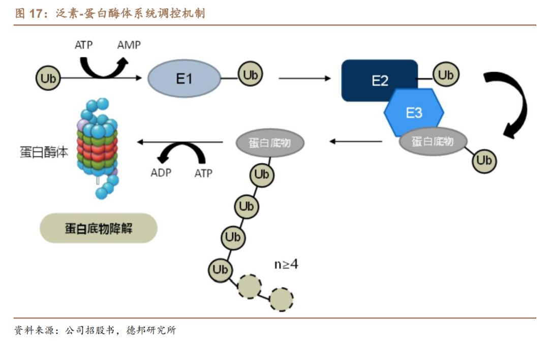PROTAC技术的作用机理为:通过泛素-蛋白酶体系统(Ubiquitin-proteasomesystem,UPS)实现的,UPS是细胞内蛋白质降解的主要途径之一。UPS 降解蛋白质可以简单地分为三个步骤:首先,由一种连接酶给目标蛋白加上泛素标签;经过多轮泛素化后就有了多个泛素标签;多聚泛素化之后的蛋白质被蛋白酶体识别并被降解。