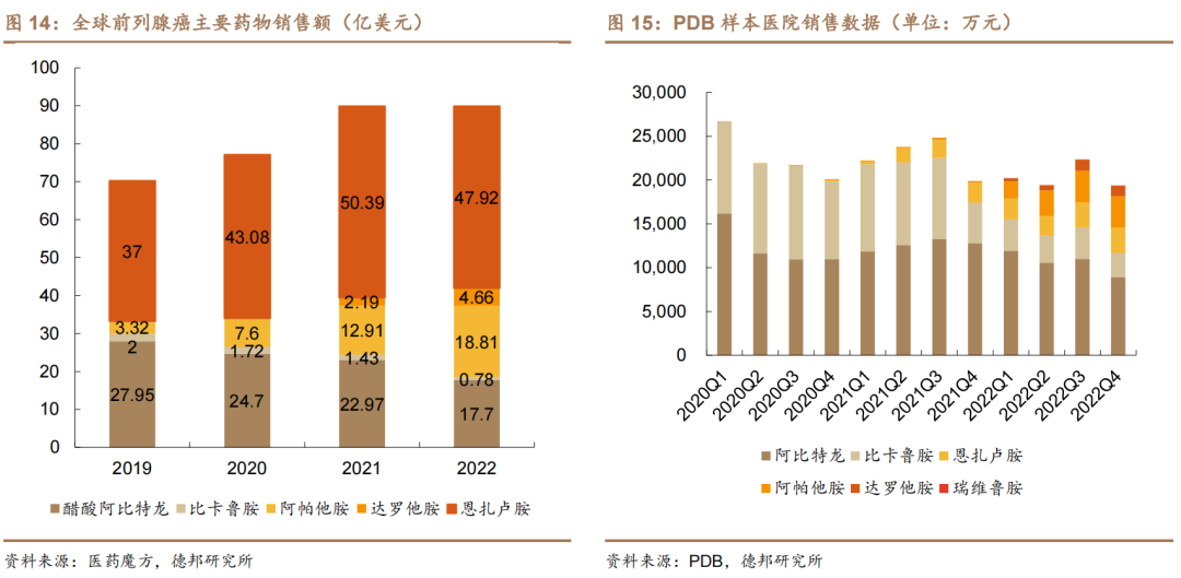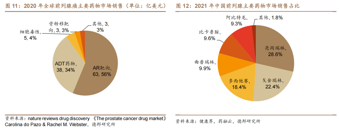 全球前列腺癌治疗药物中,AR药物占比近60%,其中恩扎卢胺占比近70%,占据龙头地位。根据《The prostate cancer drug market》文章报道,2020年全球前列腺癌治疗药物市场大约112亿美元,其中56%为靶向AR信号通路的治疗,大约63亿美元。其中恩扎卢胺占据主要市场,2020年全球销售额达43.08亿美元,占前列腺癌市场38%的份额,占AR靶向药物的68%左右。
