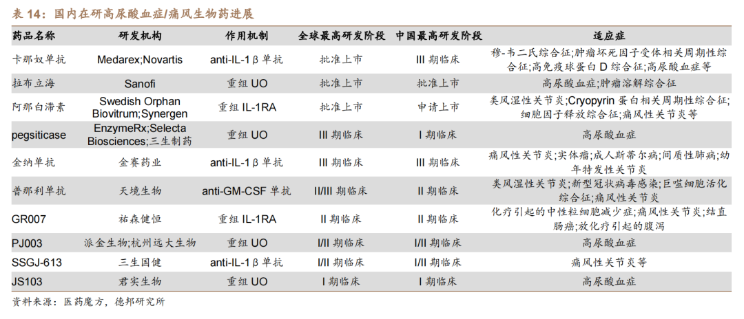 生物药的竞争相对缓和,布局IL-1β的厂家包括诺华、长春金赛等,进度靠前的是诺华的卡那奴单抗,国内处于临床三期;布局尿酸酶的厂家包括赛诺菲、君实、三生制药和远大生物制药,国产药物尚处于临床早期阶段。