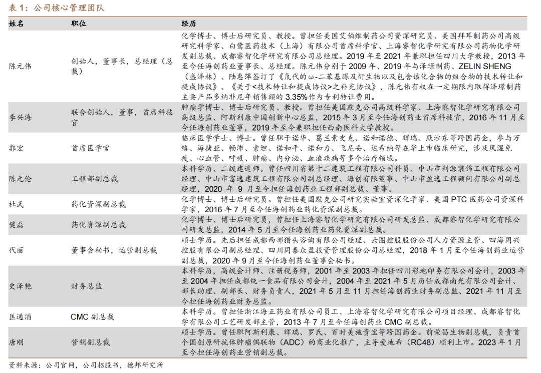 公司核心成员由多位资深海归博士组成,产业经验丰富,推动新药研发上市。公司拥有一支具备前沿国际化视野的、在国内领先或全球知名的医药研发机构从业经验的优秀研发团队。其中包括有2位国家级人才和多位四川省级人才,核心技术人员拥有世界500强、海外跨国制药企业工作经验,具备丰富的药物研发及管理经验,成功推动多个新药上市。公司核心技术团队对癌症和代谢性疾病等多个重大疾病的机理具有深入研究和理解,在药物靶点的选择与验证、化合物设计、生物模型设计、临床前研究、临床方案设计及临床研究等方面具有丰富经验和科学敏感性,为产品管线的顺利研发奠定了基础。