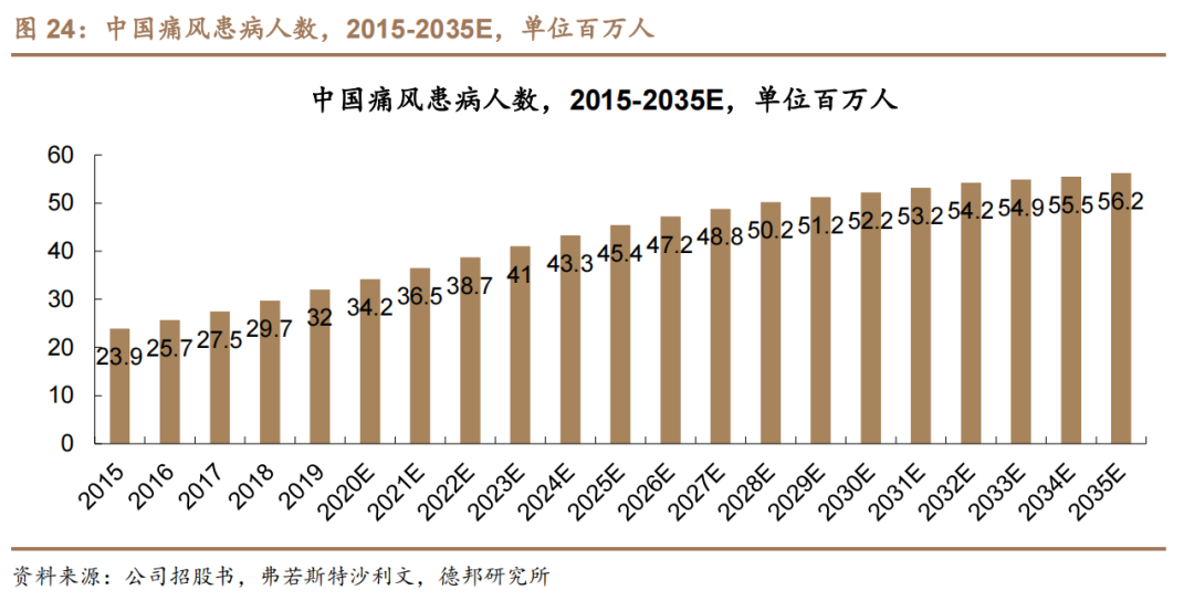 中国痛风患病人数从2015年的2,390万人增长到2019年的3,200万人,期间的复合年增长率为7.5%。据弗若斯特沙利文分析,预期未来中国痛风患病人数会持续增加,在2024年和2035年分别达到4,330万人和5,620万人。