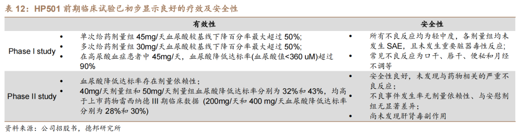 1)疗效:40mg/天剂量组和50mg/天剂量组血尿酸降低达标率分别为32%和43%,均高于上市药物雷西纳德III期临床数据(200mg/天和400mg/天血尿酸降低达标率分别为28%和30%);
