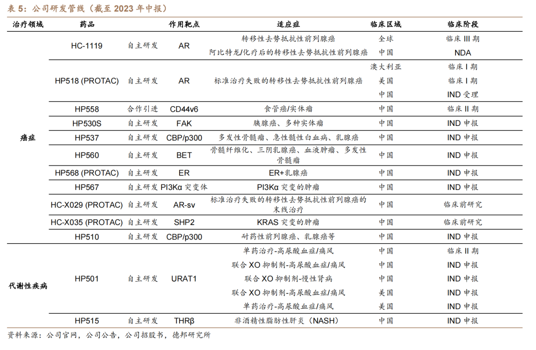 公司依托4大核心技术平台,通过自主研发与合作引进,构建了丰富的产品管线。在癌症和代谢疾病领域构建了有13项在研产品的产品管线,核心产品治疗前列腺癌症的HC-1119提交了新药上市申请,有4项产品进入临床试验的不同研究阶段段(HC-1119、HP518、HP501及HP558)。