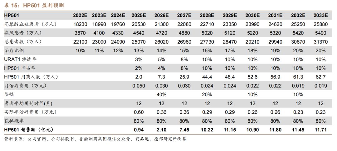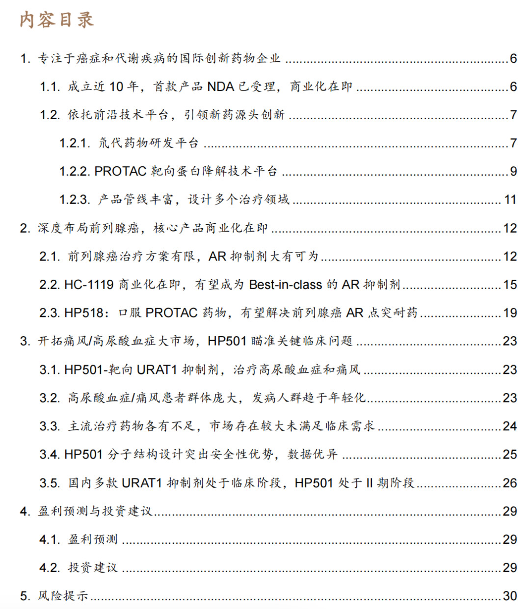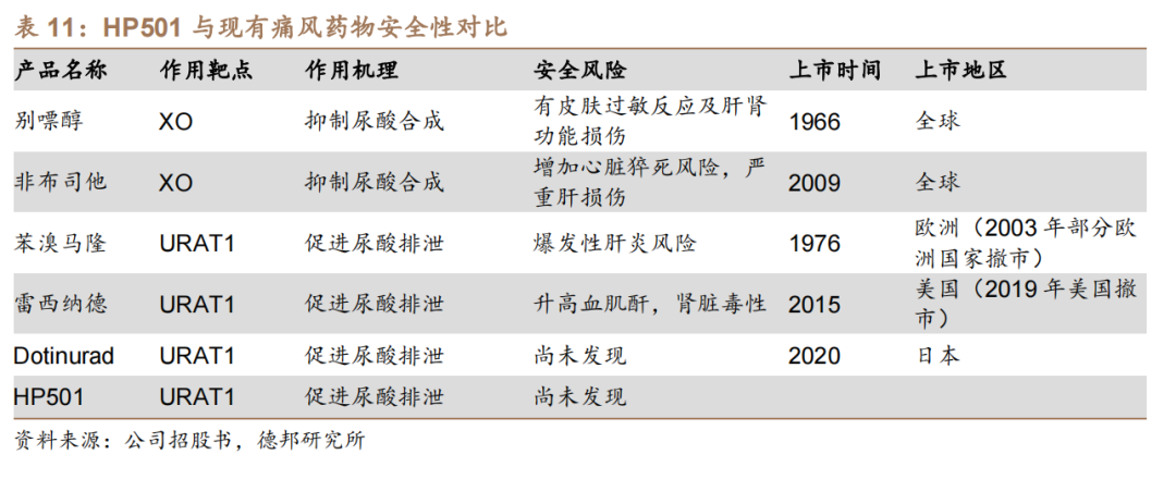 ● HP501即将进入3期临床,安全性优势明显。HP501是公司自主研发用于治疗高尿酸血症/痛风的高活性、高选择性URAT1抑制剂。中国高尿酸血症及痛风患者基数庞大,目前已上市的主流药物在安全性方面均存在明显不足,基于现有I、II期临床试验数据显示HP501具有良好的疗效,尤其在安全性方面显著优于同类产品。目前,HP501单药治疗高尿酸血症/痛风已完成多项Ⅰ期和Ⅱ期临床研究,正在开展III期临床试验相关准备工作,国内进展领先,未来市场空间巨大,预计远期销售峰值超10亿元。
