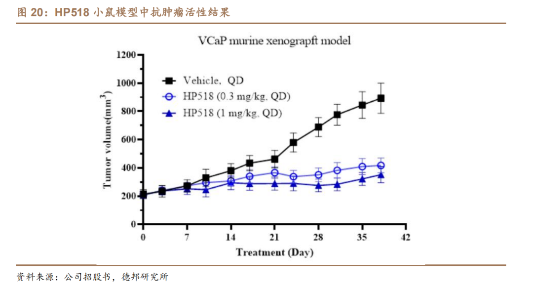 HP518具有良好的口服生物利用度。在前列腺癌小鼠模型中,0.3 mg/kg每天灌胃一次即观察到明显的抗肿瘤效果,显示了良好的抗肿瘤活性。