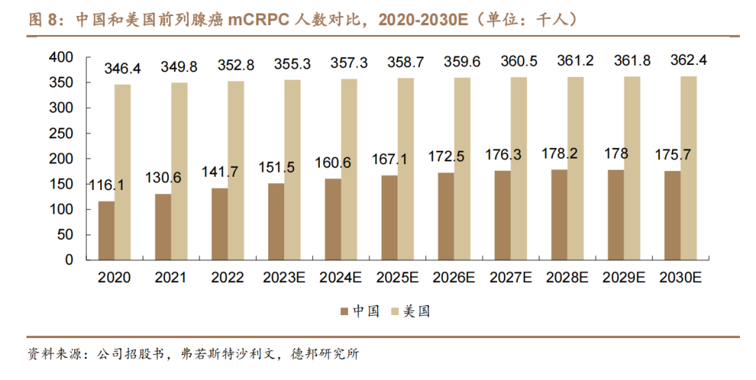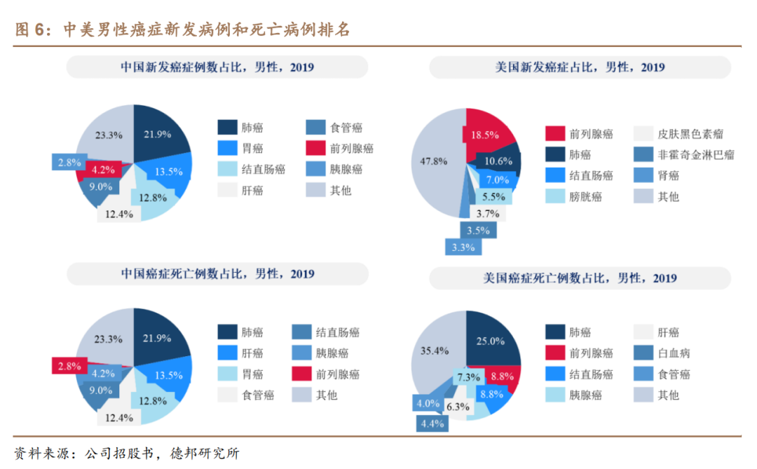 全球前列腺癌患者基数庞大,中国确诊患者多以晚期为主,市场空间大。前列腺癌是世界范围内最常见的恶性肿瘤之一,在全球位列男性恶性肿瘤发病率第二、死亡率第五。WHO国际癌症研究机构发表的全球癌症统计报告显示,2020年全球新发前列腺癌1,414,259例,占全身恶性肿瘤的7.3%;前列腺癌死亡病例375,304例,占全身恶性肿瘤的3.8%,死亡率位居第八位。在美国常年居男性恶性肿瘤发病人数第一,死亡人数第二;在中国居男性恶性肿瘤发病人数第六,是国内发病率和死亡率增长最快的男性肿瘤。