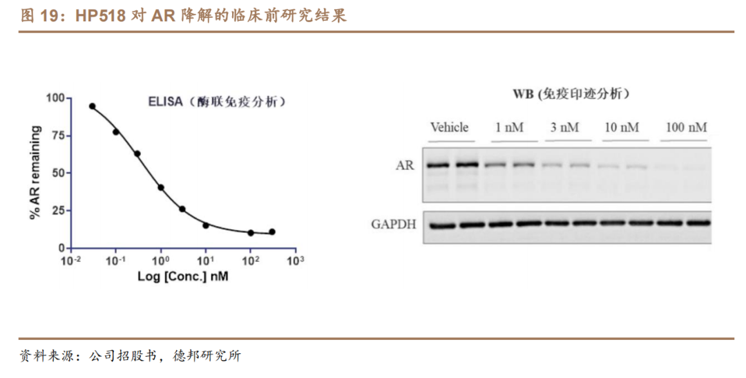 HP518可降解野生型AR及突变体。可能为由AR突变而产生耐药性的患者提供一种新疗法。此外,由于PROTAC的药物作用机制为通过AR降解完全消除AR功能,因此HP518具有成为前列腺癌早期疗法Best-in-class药物的潜力,以解决未满足的临床需求。