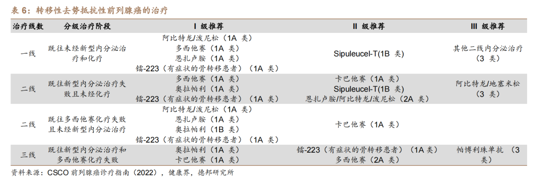 目前mCRPC患者治疗方案有限,常见疗法包括传统疗法、放疗和内分泌疗法。根据CSCO前列腺癌诊疗指南(2022)推荐,对于疾病进展为转移性去势抵抗(mCRPC)患者: