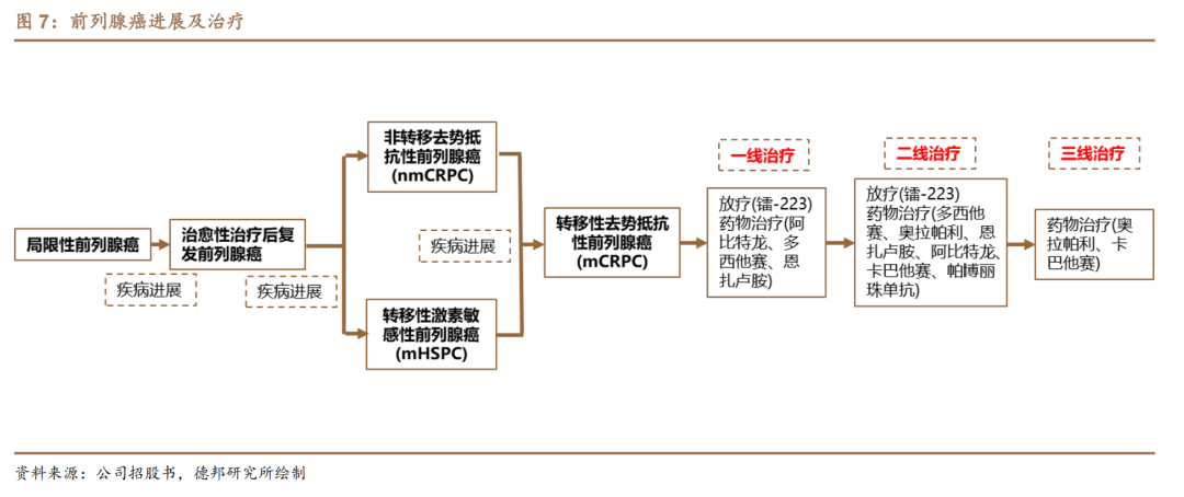前列腺癌疾病分型与治疗手段:前列腺癌根据疾病进展,主要分为局限性前列腺癌、治愈性治疗后复发前列腺癌、转移性激素敏感性前列腺癌(mHSPC)、非转移去势抵抗性前列腺癌(nmCRPC)、转移去势抵抗性前列腺癌(mCRPC)。