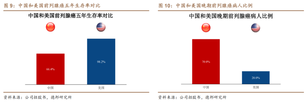 中国早筛不够普及,五年生存率较美国更低。中国前列腺癌五年生存率66.4%,是中国预后较好的肿瘤,却远低于美国前列腺癌