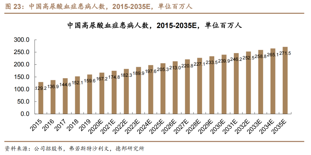我国痛风及高尿酸血症患者基数庞大,呈现明显高爆发、普遍化及年轻化趋势。近年来,在流行病学研究中观察到高尿酸血症和痛风患病率呈上升趋势。根据《中国高尿酸血症与痛风诊疗指南(2019)》显示,我国高尿酸血症的总体患病率为13.3%,痛风总体发病率为1.1%。据弗若斯特沙利文分析,中国高尿酸血症患病人数从2015年的1.29亿人增长到2019年的1.60亿人,期间的复合年增长率为5.4%。预期未来中国高尿酸血症患病人数会持续增加,在2024年将达到1.98亿人,2019至2024年的复合年增长率为4.4%。预计2035年中国高尿酸血症患病人数将达到2.72亿人。