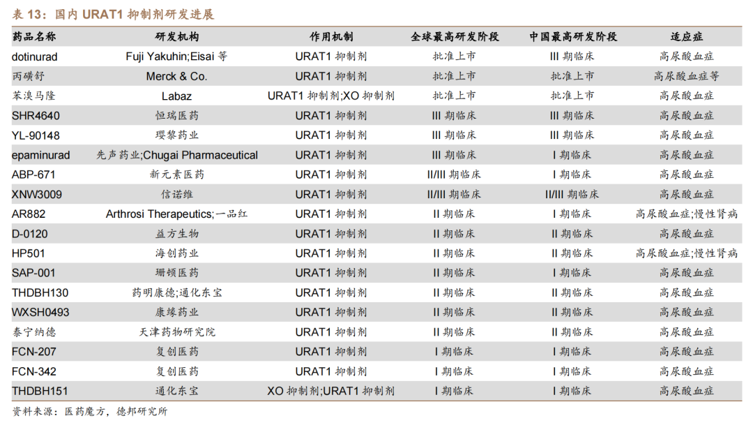 全球多家医药公司都在积极开发新型URAT1抑制剂用于高尿酸血症/痛风的治疗。目前国内进展比较快的是恒瑞的SHR4640、卫材的Dotinurad、上海璎黎药业的YL-90148、苏州信诺维的XNW3009,海创药业的HP501处于临床2期阶段,正在积极筹备3期注册临床。