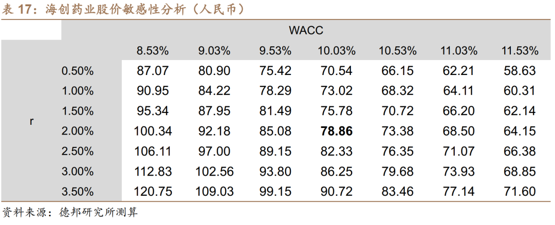 5)公司拥有丰富的产品管线和较强的自主研发能力,通过DCF方法计算,假设永续增长率为2%,WACC为10.58%,公司合理股权价值为78亿元,对应股价为78.86元。